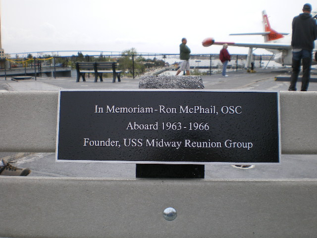 Thanks to your incredible generosity, members of the USS Midway Reunion Group, Ron McPhail’s memorial bench is now a reality and in place on Midway! Shipmates and family members, in total, you donated $1,225 in Ron’s name during the fund-raising campaign, and all of your donations went to the USS Midway Museum to purchase Ron’s bench and plaque.